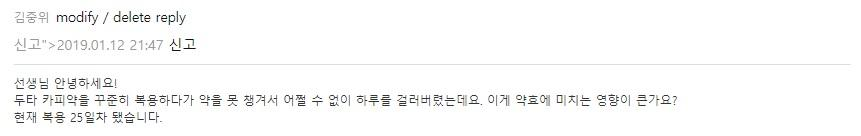 물론 매일 열심히 드시면 제일 좋겠습니다. 그러나 장기간 복용해야 하는 약이고, 하루 이틀 빠졌다고 크게 문제가 되지는 않습니다. 마치 운동 같다고 생각하시면 쉽습니다. 매일 운동하는 사람이 어쩌다 며칠 운동을 못했다고 뚱뚱해지거나 체중이 갑자기 불어나지 않는 것과 비슷합니다. 운동을 멈춘 시기가 길어질수록 살이 찌거나 근육이 사라질 수 있지만 짧은 기간 눈에 띄는 변화는 없는 것과 마찬가지입니다.