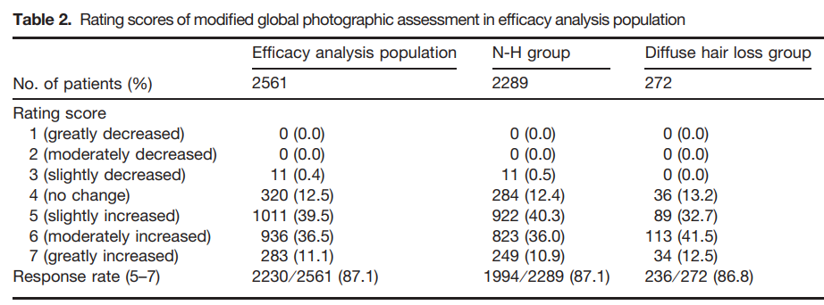 두 그룹 사이에 탈모약을 복용하고 증상이 개선된 비율이 거의 차이가 없습니다. (87.1% & 86.8%) 확산성 탈모를 겪는 분들도 탈모약의 효과를 충분히 볼 수 있다고 말씀드릴 수 있겠습니다.