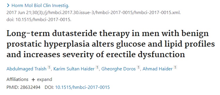 위 연구에서 저자는 배뇨장애가 있는 환자를 대상으로 3~3.5년간 두타스테리드를 먹은 230명과 탐스로신(tamsulosin; 알파 1 수용체 작용을 차단하여 배뇨장애 증상을 완화시키는 약물)을 먹은 230명을 비교하였는데, 두타스테리드를 복용한 군에서 혈당(glucose), HbA1c(당화혈색소), TC(총 콜레스테롤), LDL(저밀도 지질), 간효소(ALT, AST) 수치가 높아졌다는 결과를 얻었습니다. 테스토스테론의 수치는 낮아졌고요. 그래서 결론적으로 두타스테리드를 먹는 사람들은 주의해야 한다는 결론을 냈습니다.