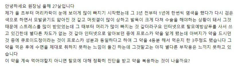 피나스테리드 성분 탈모약을 먹은 지 3주 정도 됐습니다. 그 약을 먹은 후에 수면을 제대로 취하지 못하는 느낌이 들긴 하는데 그것 말고는 아직 별다른 부작용은 느끼지 못하고 있습니다. 계속 먹어도 될까요?