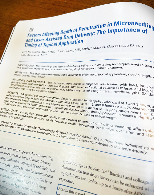 논문에 의하면, MTS 시술 전 미리 성분을 도포해두는 것이 나중에 도포하는 것에 비해 더 깊이 침투하였고, 펜 타입이 롤러 타입의 MTS보다 더 깊이 들어갔습니다.