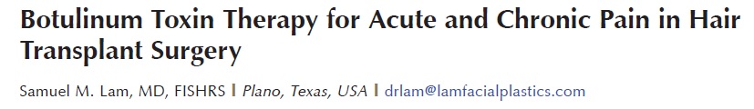 최근 저희 병원에서도 탈모치료 목적으로 보톡스를 사용하기 시작하여 병원에 보톡스가 준비되어 있는 상태였는데, 모발이식 후 통증이나 흉터 목적으로의 사용도 검토해보겠습니다. 모발이식 수술에서 환자분들을 좀 더 편하게 해 드릴 옵션이 생기는 것 같아서 좋습니다.