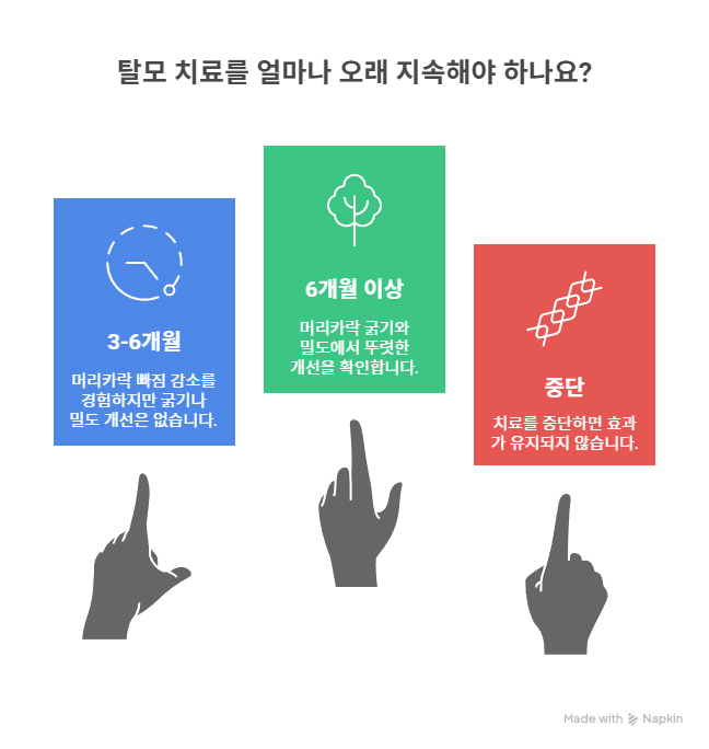 탈모는 만성적인 진행성 질환이므로, 약을 꾸준히 장기간 복용하는 것이 핵심입니다. 단기간 복용 후 중단하면 효과가 유지되지 않습니다.