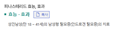 • 효능•효과 : 성인 남성(만 18~41세)의 남성형 탈모증(안드로젠 탈모증) 치료