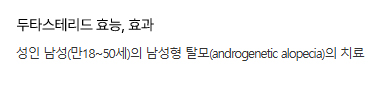 • 효능•효과 : 성인 남성(만 18~50세)의 남성형 탈모(androgenetic alopecia) 치료