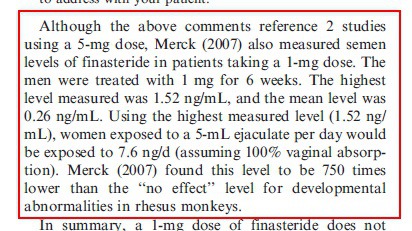 가장 높은 농도로 측정된 1.52 ng/mL 에 여성이 매일 5mL 정도 노출되고 100% 흡수된다고 가정 시 7.6 ng/d 인데, 이 수치는 동물실험에서 이상이 없다고 알려진 수치보다 650-750배 정도 낮은 수치입니다. 따라서 임신 시 프로페시아 복용은 크게 걱정할 필요가 없다는 결론입니다.