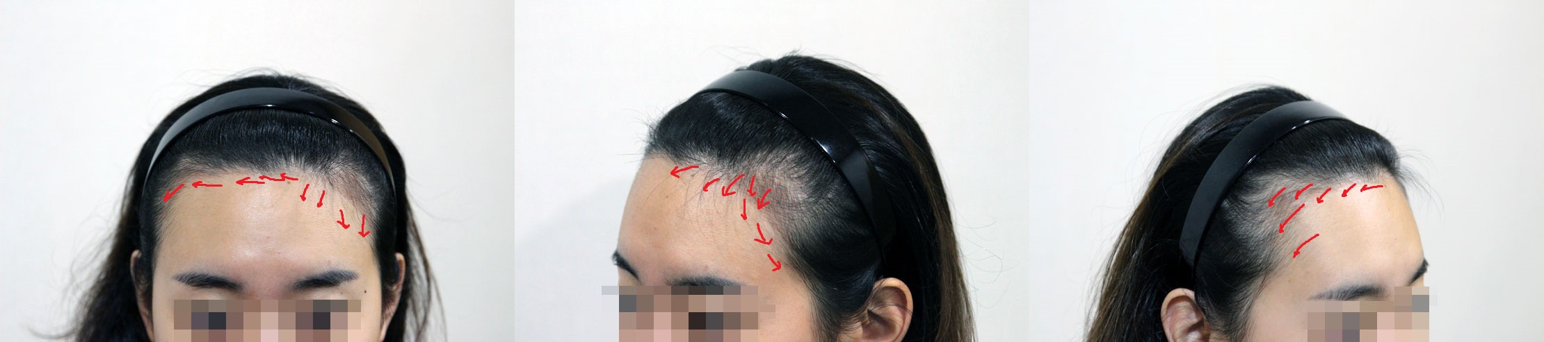 헤어라인교정 시에는 원래 특별한 이유가 없다면 머리카락의 흐름대로 이식하는 것이 정석입니다. 흐름을 바꾸면 기존 머리와 조화가 안 맞아 어색해 보일 수 있기 때문입니다. 그런데 위와 같이 흐름이 비대칭인 케이스에서 헤어라인 교정을 시행하면 비대칭이 조금 더 도드라져 보일 수 있습니다.