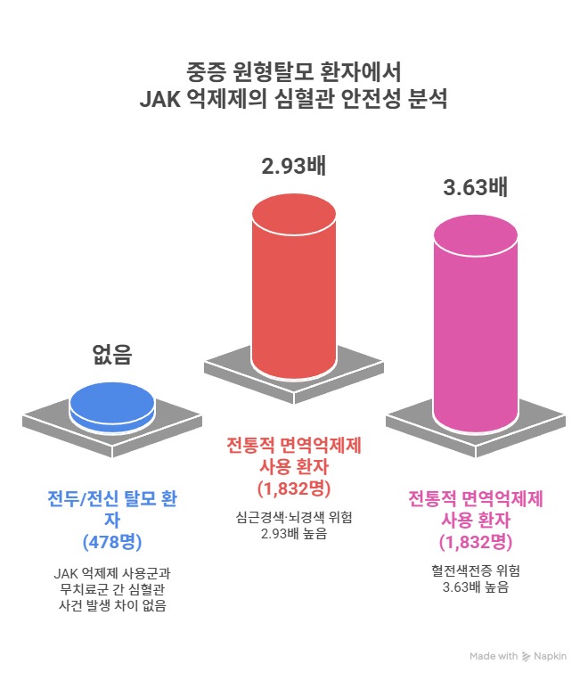 | 무치료 vs JAK 억제제 (전두/전신탈모) | 심혈관 사건 차이 없음 | JAK 억제제 안전성 확인 |