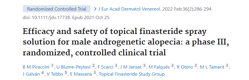 다음 보실 논문은 2022년 2월 유럽피부과학회지에 실린 topical finasteride 임상 3상 연구 결과입니다. 저널의 impact factor도 6.166으로 높고, 그동안 쌓인 데이터를 기반으로 진행한 근거 레벨이 가장 높은 임상 시험 결과에 대한 연구 논문입니다.