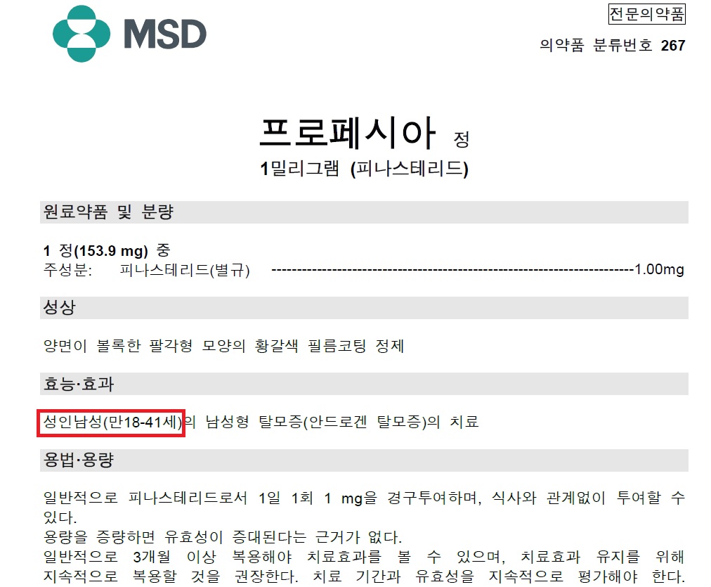 프로페시아 약 설명서에도 위 사진과 같이 만 18-41세라고 표시되어 있고,